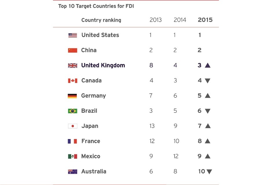 The UK is recognised by global business executives as the top destination in Europe for investment and has risen in the 2015 AT Kearney FDI Confidence Index to become the third most sought after country in the world for investment. This is the third consecutive year in which the UK has improved its ranking, further confirming the confidence and trust that the global business community places in the UK and signalling that this strong performance will continue in 2015/16.