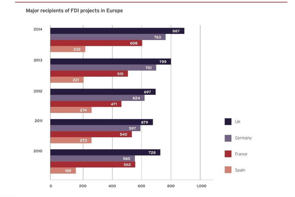 According to the FT fDi Report (2015) the UK received 909 FDI projects in 2014, 8% higher than last year and significantly more than other major European economies such as Germany (378), Spain (252) and France (237).