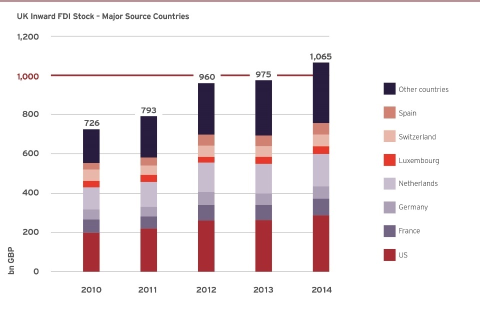 Based on OECD estimates, the value of the UK’s inward FDI stock increased by more than 9% during 2014, passing the £1 trillion level for the first time. UK FDI stock has increased by almost 50% since 2010, reaching £1,065 billion by the end of 2014. UKTI remains committed to its internal ambition to help increase inward FDI stock to £1.5 trillion by 2020 and these latest results show that the UK is likely to achieve this.