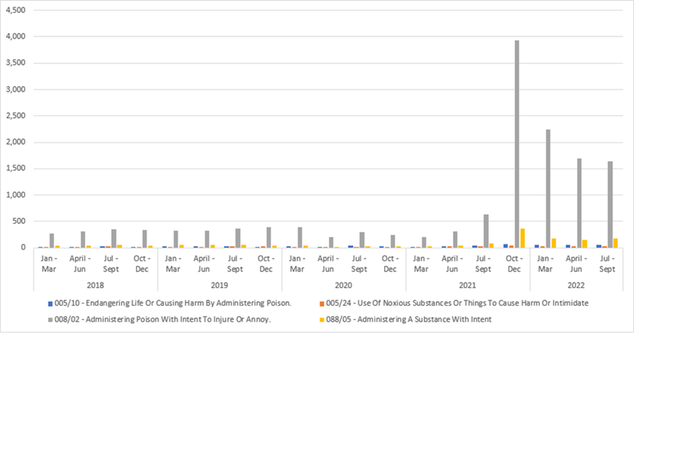 Bar chart showing the rise in 'Administering poison with intent to injure or annoy' in autumn 2021.