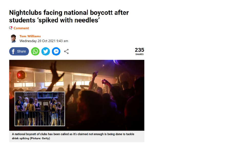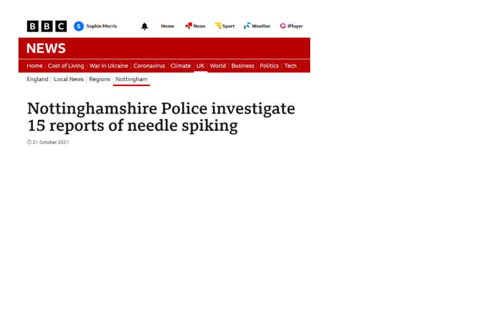 Most experiences we know about centre on the administering of substances through “drink spiking.” So when we began hearing about a new trend of “needle spiking” in public spaces in Autumn 2021[footnote 5], there was understandable public concern and fear, particularly amongst young women. These concerns focused on the greater risk faced by young women of being spiked when on nights out and experiencing the adverse effects of such, including being at an increased level of vulnerability to further harm but also the long-term physiological impacts. The Home Secretary at the time asked the National Police Chiefs’ Council (NPCC) to urgently review the situation.