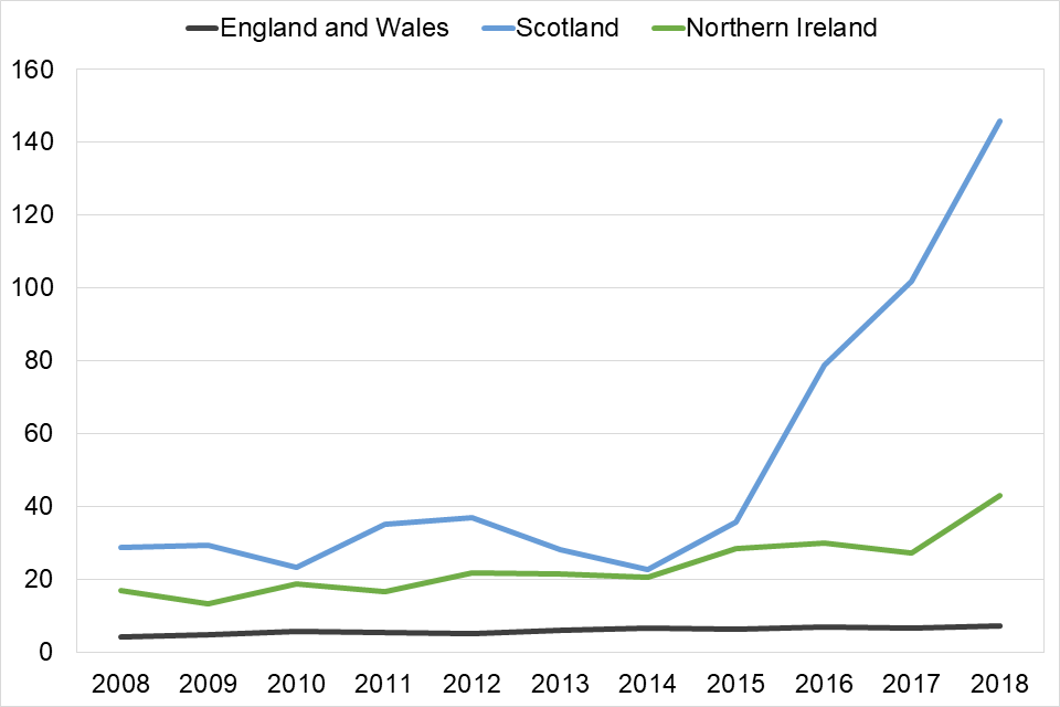 The data covers people starting treatment during the calendar year in England and Wales and during the financial year in Scotland and Northern Ireland. To make it easier to use, all data is referred to in calendar years. For example, data for 2017 to 2018 for Scotland and Northern Ireland is referred to as 2018 data. Data on people starting treatment in the most recent financial year in Northern Ireland is not available, so the most recent figures are for 2017.