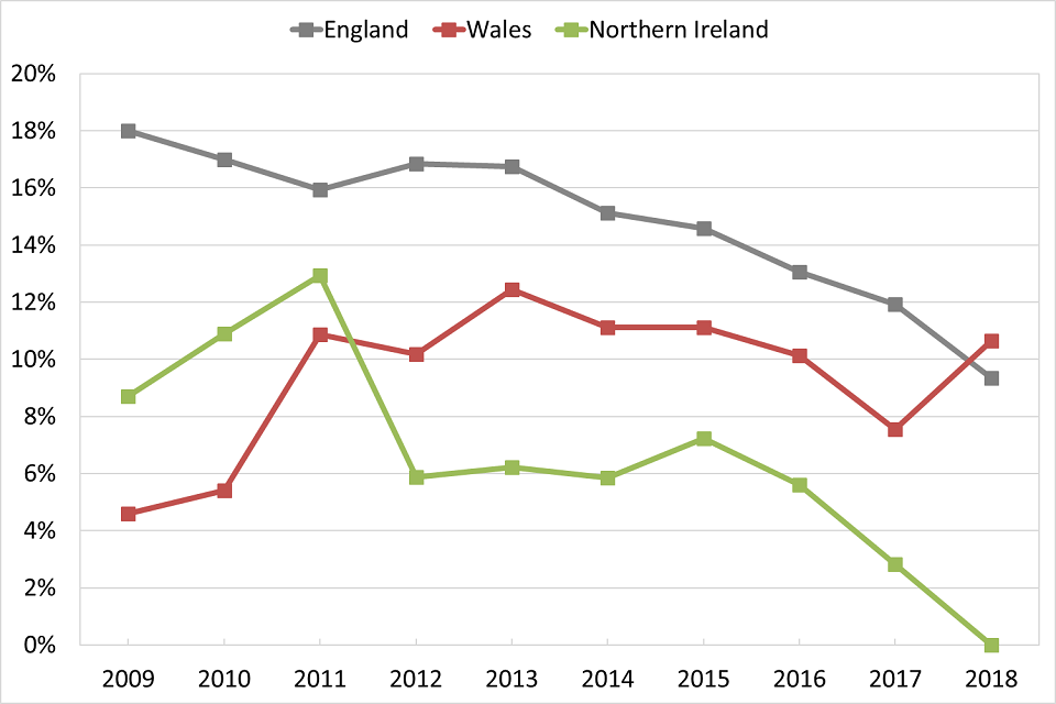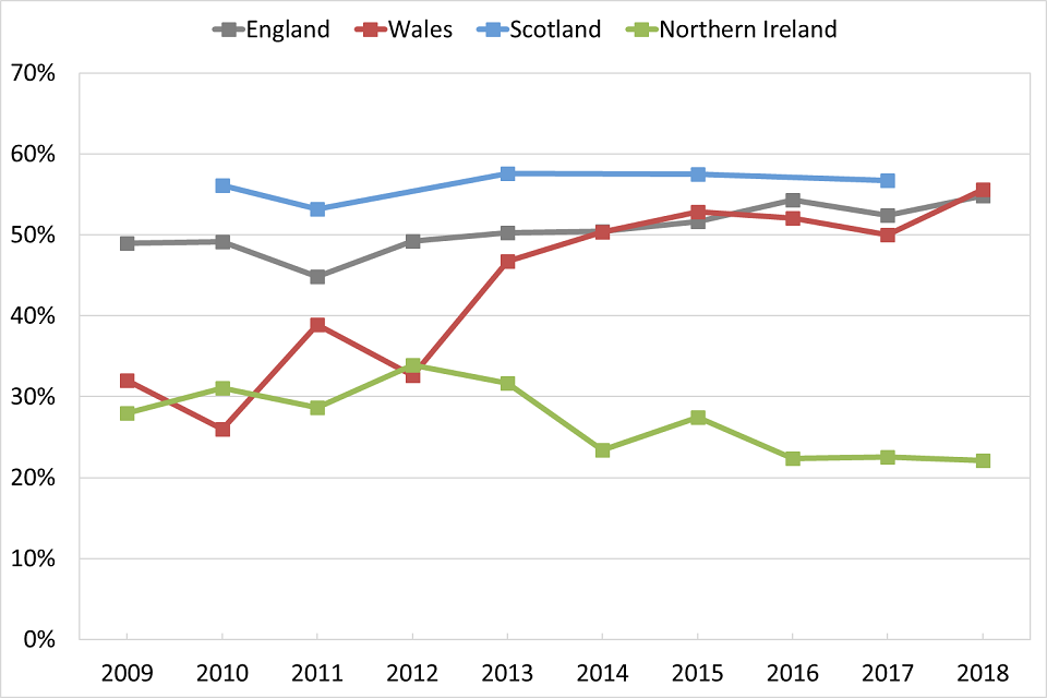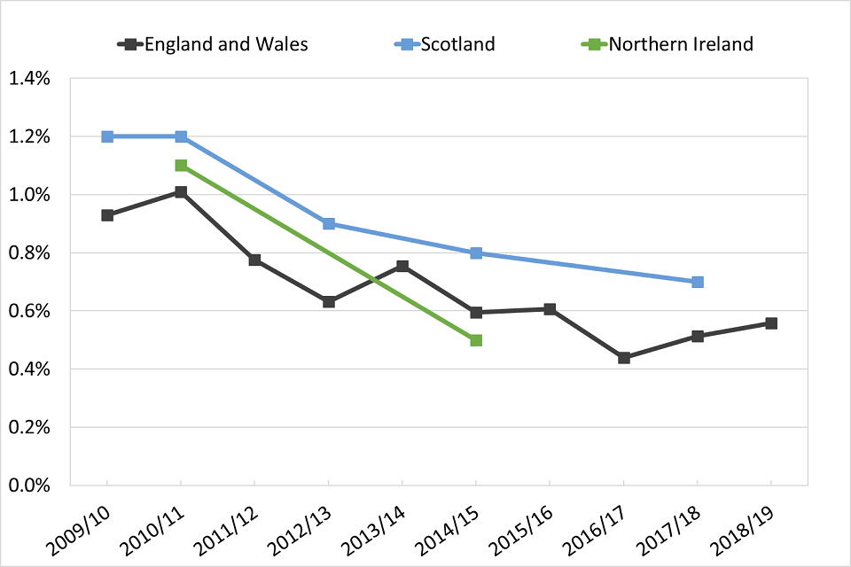 The proportion of 16 to 59 year olds in England and Wales who took drugs in the last year currently stands at 9.4%. The proportion of 16 to 64 year olds in Scotland who took drugs in the last year was 12% in 2017 to 2018, an increase from 7.6% reported in the 2014 to 2015 survey. Northern Ireland has the lowest prevalence in the UK of drug use in the last year: 5.9% of 15 to 64 year olds reported it in 2014 to 2015.