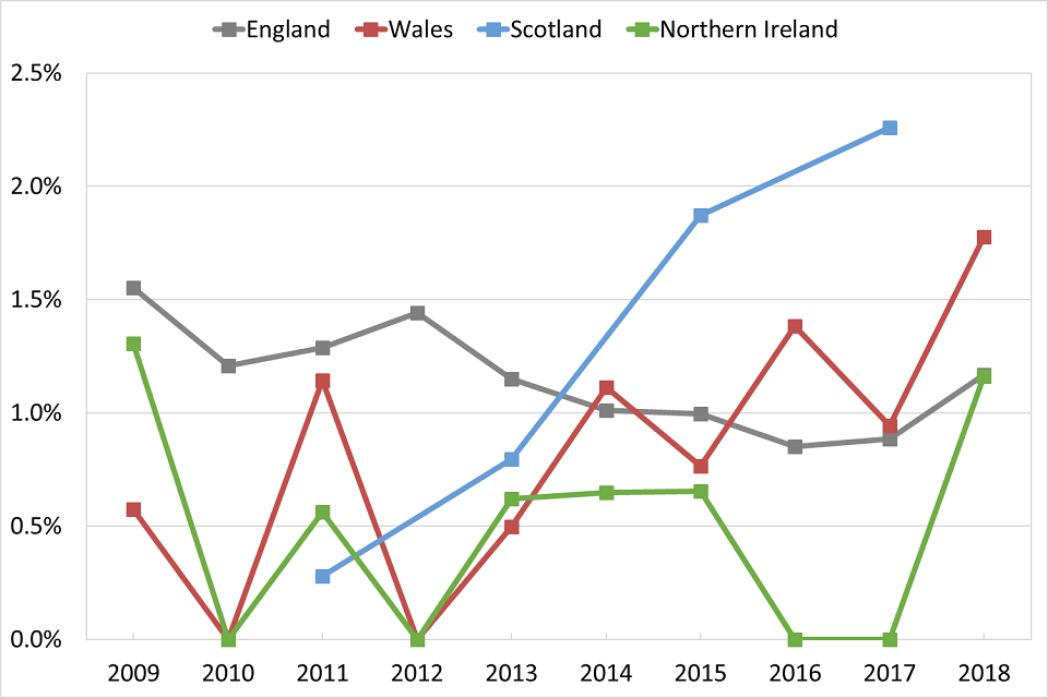 Data broken down by primary substance is available for people starting treatment in prison in England, Scotland and Northern Ireland. The most recent data for England is for people starting treatment in the 2018 calendar year, data for Scotland covers the 2017 to 2018 financial year and Northern Ireland is for the 2016 to 2017 financial year. To make it easier to use, we refer to the Scottish and Northern Irish data by calendar year, so data for 2017 to 2018 is referred to as 2018.