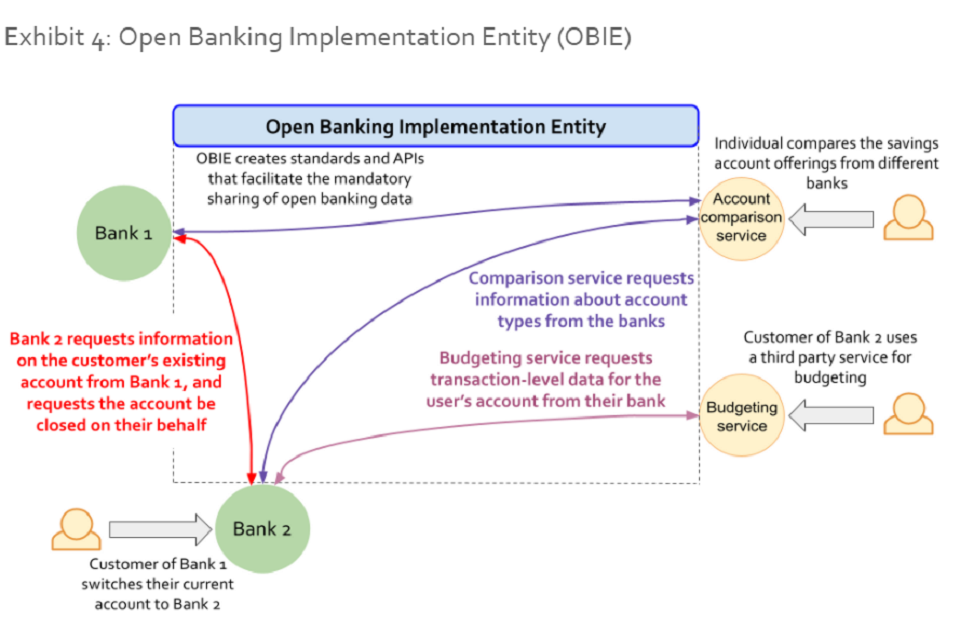 OBIE creates standards and APIs that facilitate the mandatory sharing of open banking data.