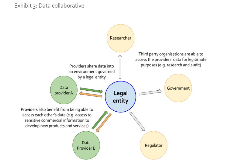 Exhibit 3 shows how a data intermediary (the legal entity) could act as a data collaborative enabling data providers (e.g. A and B) to share their data with other parties (e.g. researchers, the government, or regulators) that have a legitimate interest in accessing their data. The data intermediary manages access rights to the data it holds and ensures compliance with relevant data protection regulations.