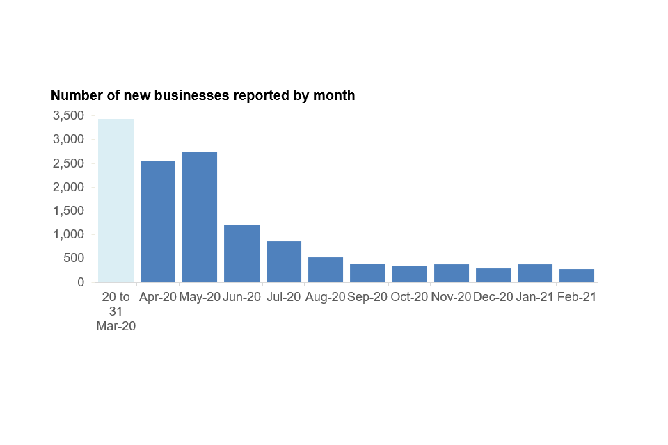 This chart shows the number of new businesses reported to us by month. The number is highest in March 2020 with 3,400 new businesses reported in the first 12 days of the form going live. It is around 2,600 and 2,700 in April and May 2020. The number of new businesses drops sharply after that. The latest figure for February 2021 is under 300.