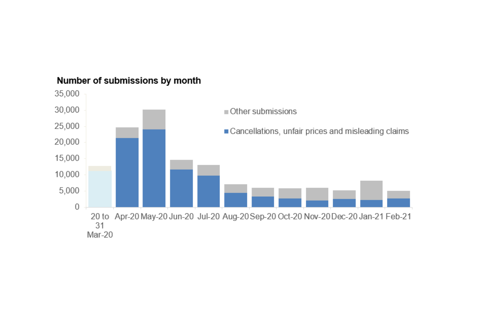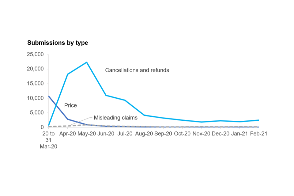 The average from April 2020 to February 2021 is around 12,000 submissions a month, with a peak of 30,000 submission in May 2020 which follows the announcement of our programme of work to investigate businesses failing to respect cancellation rights.[footnote 4]The May peak is followed by a steady decline to 5,000 submissions in December 2020. Submissions increased in January 2021 to 8,000, coinciding with the start of the third national lockdown, before falling again to 5,000 in February.