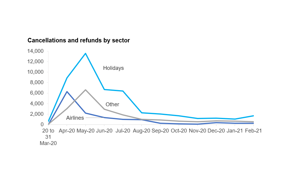 The sharp increase in complaints about airlines in April 2020 might reflect campaigns at the time by consumer organisations and other groups about the approach to refunds by a number of major airlines, while the May peak for other sectors follows the announcement of our programme of work to investigate businesses failing to respect cancellation rights.[footnote 8] Since then, complaints have fallen to relatively low levels across all sectors: from 13,500 in May 2020 to 1,700 in February 2021 for holidays; from around 6,500 at the peak to 500 and 300 in February 2021 for other sectors and airlines respectively.