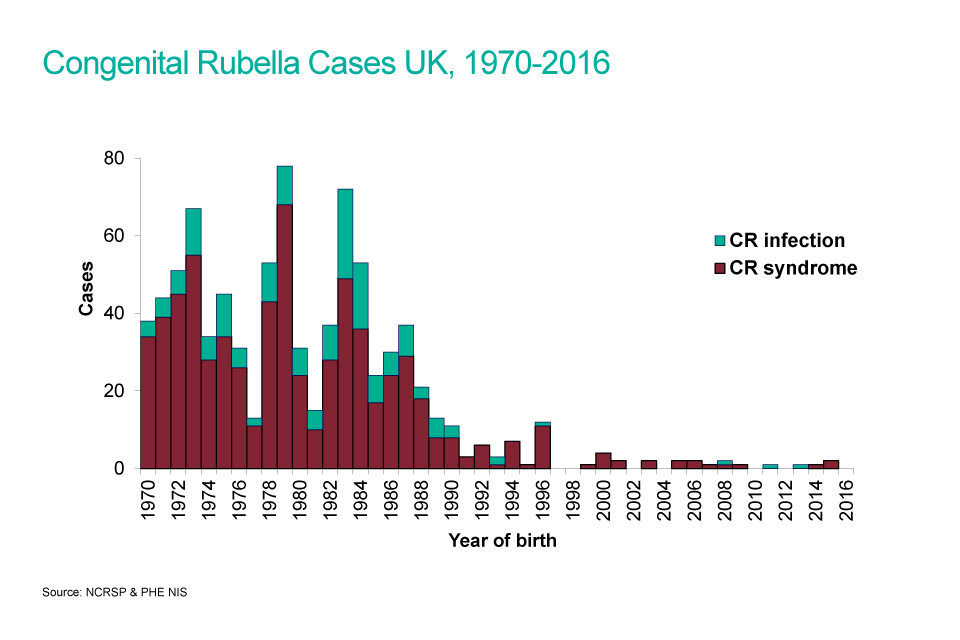 Before rubella vaccine became available, an estimated 200 to 300 babies were born each year with CRS in the UK. In the 10 years between 2005 and 2014 there have been 7 cases of CRS born in the UK.