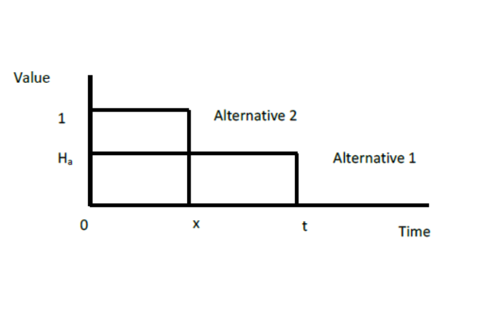 A technique developed specifically for use in health care is the time trade-off (TTO). As in the SG respondents are presented with a choice but this time the choice is between 2 certain options. For chronic health states (see Figure 2) TTOs are presented as a choice between living in a health state ha (full health>ha>dead) for a certain time period (t) (alternative 1) or living in full health for a shorter time period (x) (alternative 2); x<t. A point of indifference is reached by varying x. The value assigned to ha = x/t.