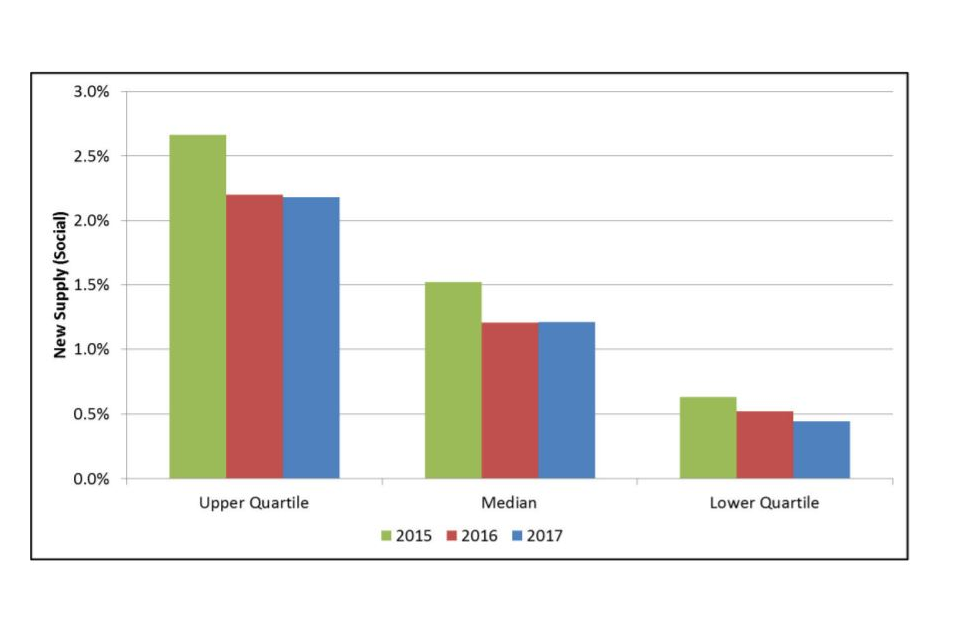 The average (mean) level of new supply (social) as a proportion of existing stock across the sector was equivalent to 1.5% of existing stock in 2017, significantly above the sector median of 1.2% (denoted by red line). The difference is driven by a number of registered providers with new supply (social significantly above the average). In total, 26 registered providers delivered new supply (social) above 3% of their total stock owned. There remains a significant minority (circa 10%) of registered providers that deliver little or no new supply (social). Some of these registered providers include those with fewer than 2,500 units, LSVT organisations that are less than seven years old and supported housing/ housing for older people providers. The number of registered providers delivering little or no new supply (social) is smoothed out over a two-year period (2016 and 2017) and dips to circa 3%