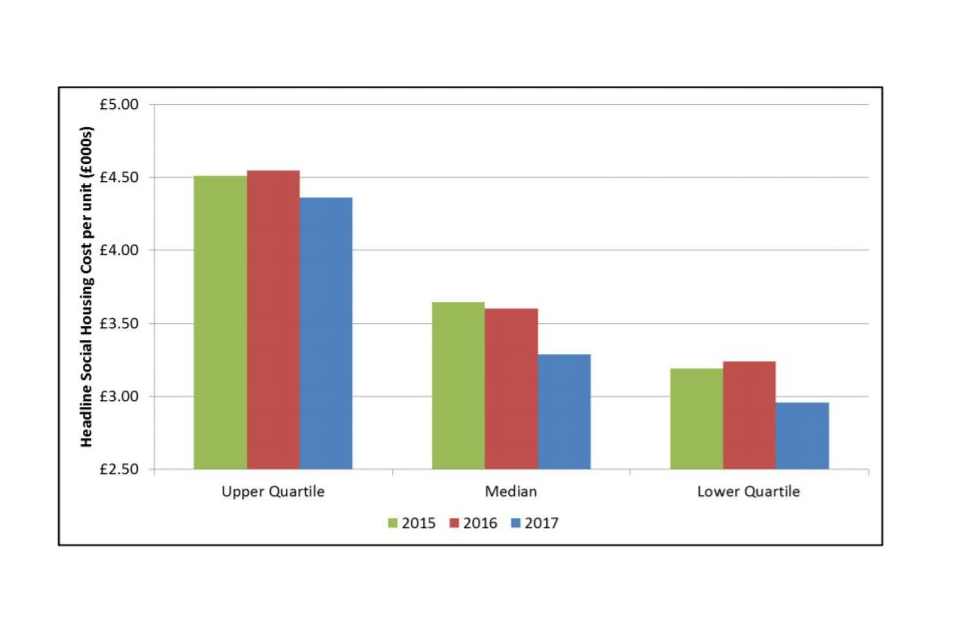In recent years, pressure on rental income has also led most providers to drive down costs and seek operational efficiencies. Reductions in headline social housing cost per unit have been recorded across each of the quartiles. Between 2015 and 2017 the average (mean) headline social housing cost has reduced by 6.4% from £4,040 to £3,780 per unit. A significant part of the reduction in costs is due to a deferral of major repair expenditure in the period following the rent cuts.