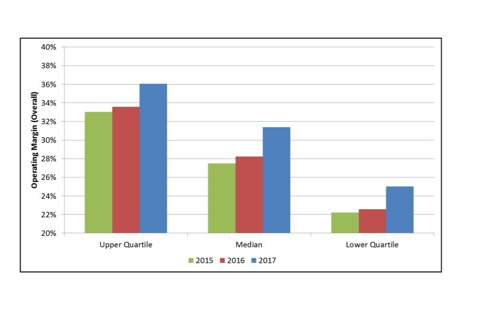 In each of the last two years, operating margin (overall) has increased across all three of the quartile measures; with the median now standing at 31.4%, up from 28.2% in 2016 and 27.5% in 2015.