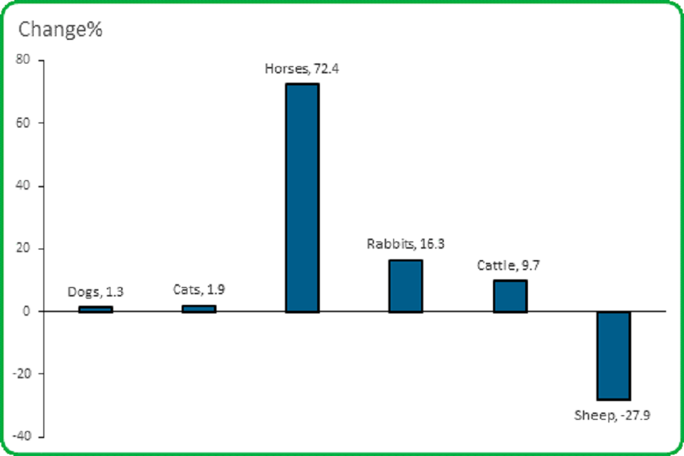 A large increase in the number of all reports involving horses was offset by a large decrease in those involving sheep