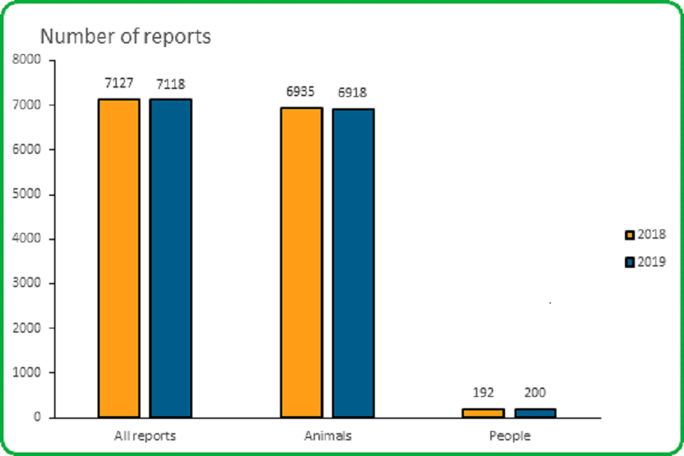 - The number of animal reports in 2019 decreased from 6,935 in 2018 to 6,918; a decrease of 17 (0.2%)