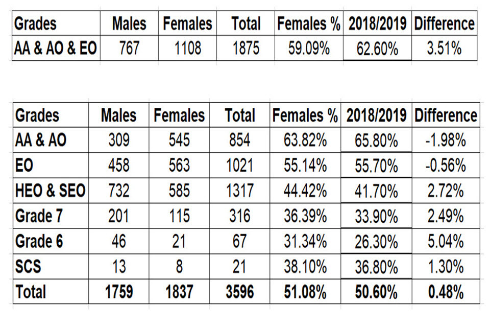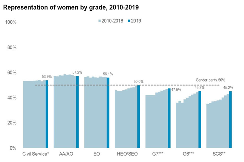 Overall, 53.9% of the Civil Service are women in 2019. Current figures have yet to be published. While the over representation of women at grades EO and below has remained largely static over time, there is a distinct increase in the representation of women at HEO and above over time. The VOA matches these general trends.