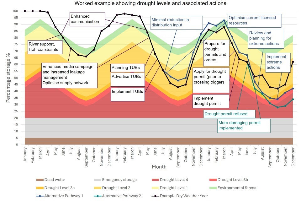 A line graph shows the path of example dry weather that crosses the various drought levels and percentage storage levels. Examples of drought plan actions that could be triggered at different points along this line are shown in text boxes, illustrating the core drought plan in action. Two examples are also given of alternative pathways that could be triggered and lead to different actions away from the main line graph of the core plan.