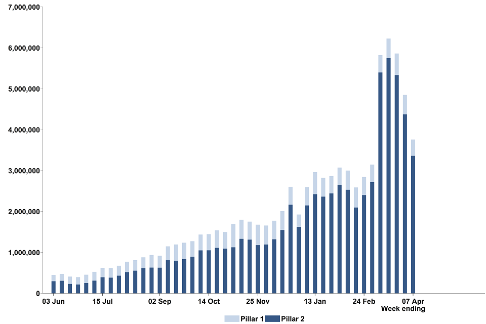 3,760,477 people were tested at least once[footnote 1] between 1 April and 7 April 2021 for COVID-19, a 22% decrease compared to the previous week. The large increase in people tested over the last 5 weeks is due to the return of secondary school students to schools from 8 March, as students are regularly tested using rapid tests. The decrease observed in the last 2 reporting weeks is due to some schools being on Easter break during this time period.