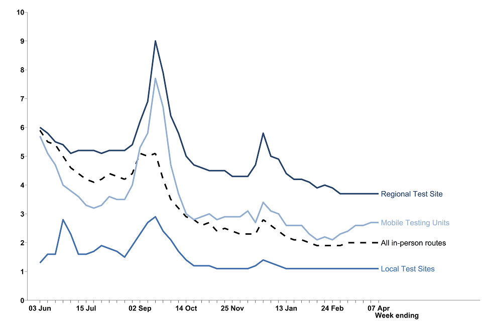 Turnaround times for pillar 2 (virus testing for the wider population) for all in-person testing routes have become shorter overall since the beginning of December 2020. In the most recent week, 88.8% of in-person tests were received within 24 hours compared to 90.6% in the previous week.