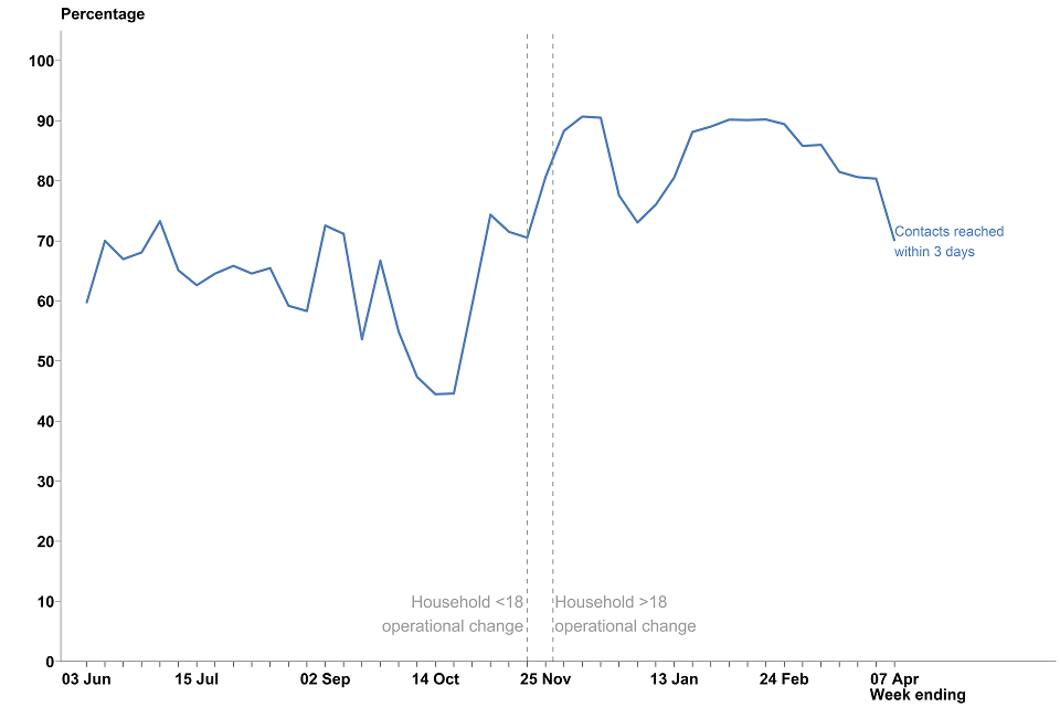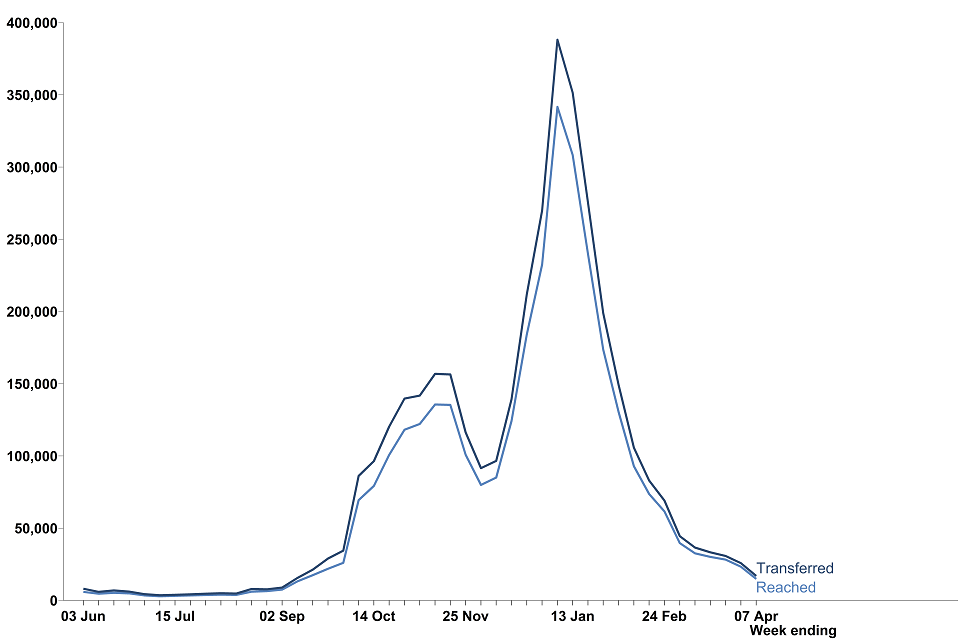 Of the cases transferred to the contact tracing system between 1 April and 7 April 2021, 87.9% were reached and asked to provide information about their recent close contacts. This has remained broadly consistent since November 2020.