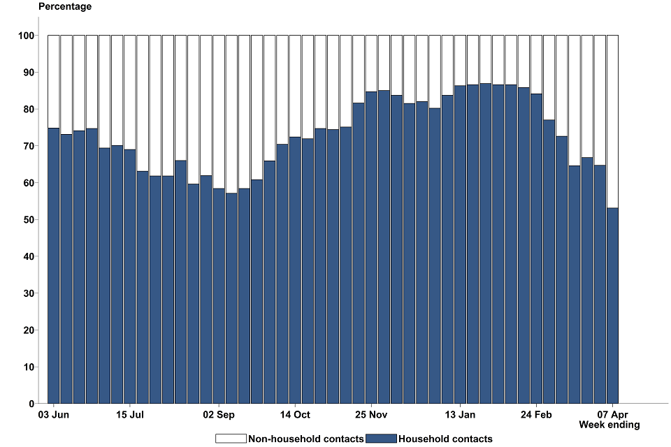 Between 1 April and 7 April, 61,826 people[footnote 2] were identified as coming into close contact with someone who had tested positive. The number of close contacts identified has decreased in the latest week.