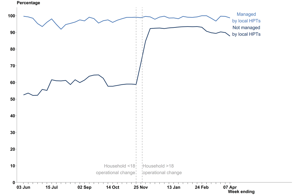 11. Contacts managed by local HPTs are reached when the situation has been dealt with and advice has been issued to the institution, whereas contacts not managed by local HPTs must be individually contact traced (unless they are a household contact) to be classified as reached.
