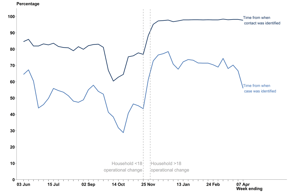 NHS Test and Trace is for England only, therefore the figures in this section are given for England. Weekly figures for UK testing are available to download from the weekly collection page and are also available daily on the coronavirus in the UK dashboard. Information on contact tracing in Scotland, Wales and Northern Ireland can be found directly from Public Health Scotland, the Welsh government and the Northern Ireland Public Health Agency.