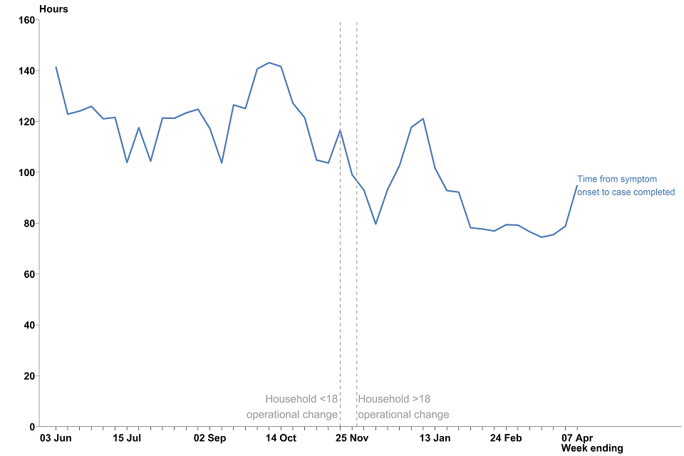For contacts not managed by local HPTs who were told to self-isolate, the median time taken for contacts to be reached from the case that identified them reporting to first observe symptoms[footnote 13] was 95 hours.