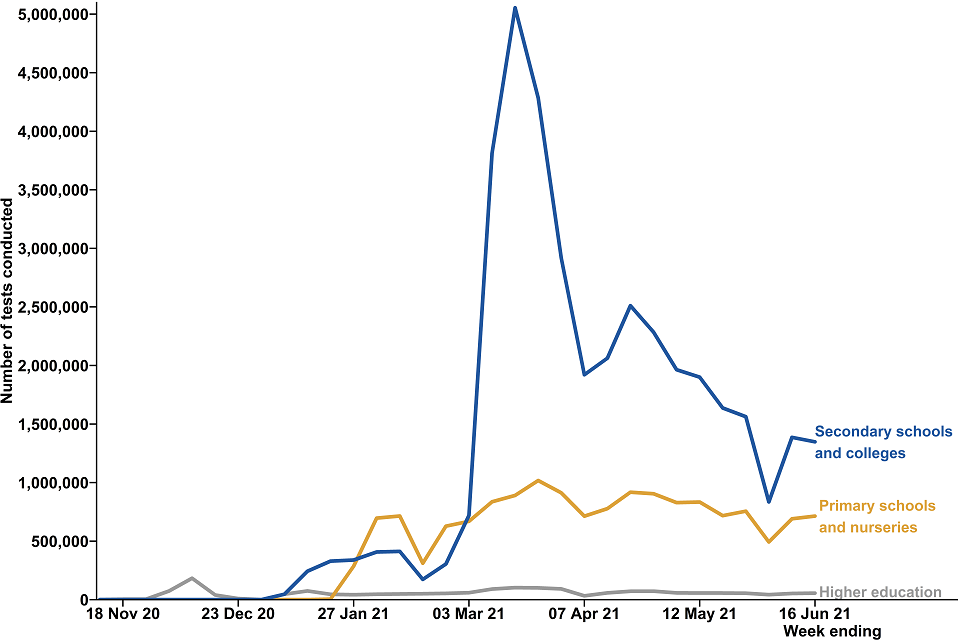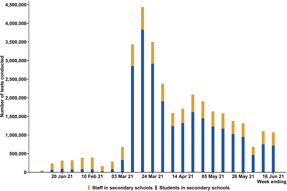 In the latest week ending 16 June, 713,457 LFD tests were taken by students in secondary schools which is a decrease from 751,857 tests in the previous week. Of these, 28,241 tests were assisted at a test site and 685,216 tests were self-reported.
