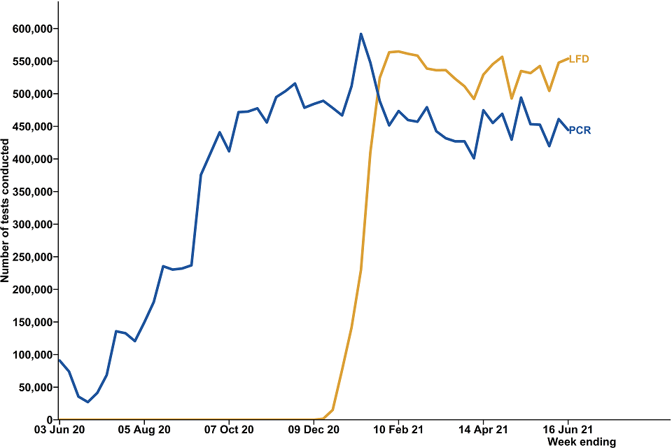 This publication focuses on rapid testing using lateral flow device (LFD) tests, however polymerase chain reaction (PCR) tests are included where appropriate, either for comparison or where regular asymptomatic PCR testing is used. All data used in the report can be found in the ‘Tests conducted’ data tables on the weekly collection page. This includes information on both LFD and PCR tests at lower-tier local authority level.