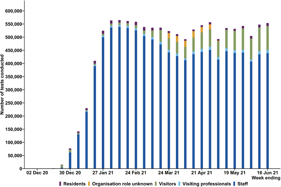 In the latest week, 11,758 LFD tests were taken by visiting professionals in care homes, in comparison with 91,573 tests taken by visitors. The number of tests conducted by visitors increased in the latest week (10 June to 16 June).