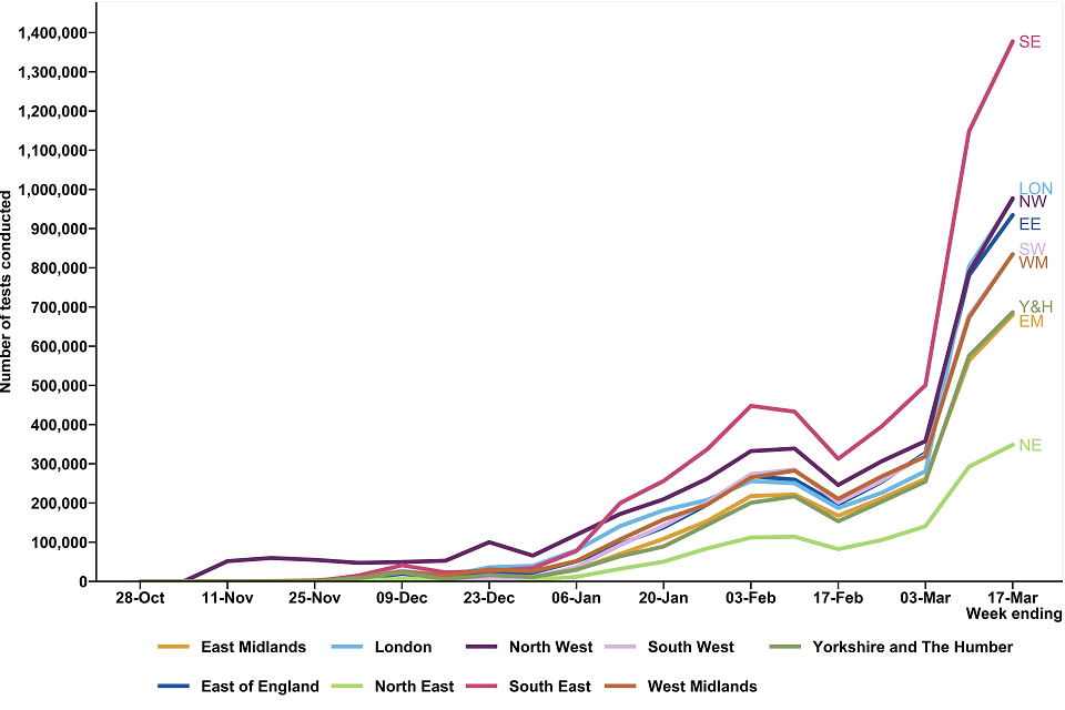 The number of LFD tests conducted has increased steeply across all regions in the latest week, continuing the upward trend from the previous week. This follows a decrease between 11 February and 17 February which coincided with half term. Between 11 March and 17 March 2021, the most LFD tests were conducted in the South East followed by the North West.