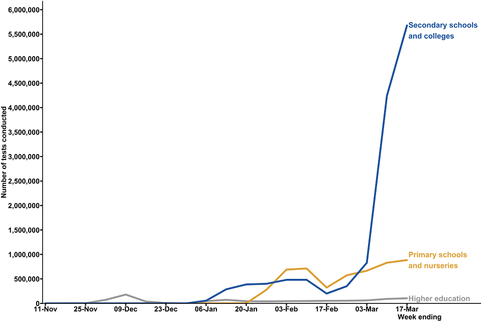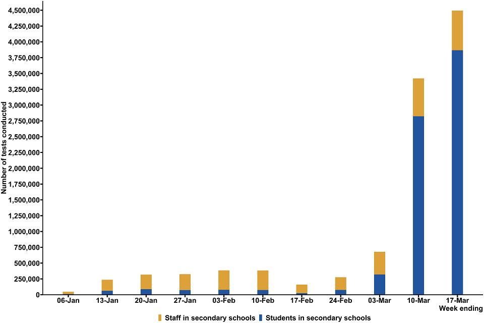 In the latest week, 3,867,007 tests were taken by students in secondary schools. This has increased over the last 4 reporting weeks with a steep increase observed since week commencing 4 March, coinciding with students return to school.