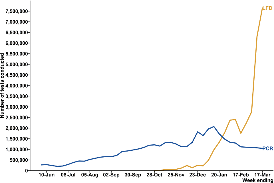 PCR and LFD tests have different uses and are therefore applied in different situations (see the Types of tests section above for more information). The primary purpose of rapid LFD testing is to identify people with COVID-19 who do not have symptoms. As the number of LFD tests conducted increases, more asymptomatic positive cases are identified earlier and therefore they are less likely to transmit the virus to their contacts.