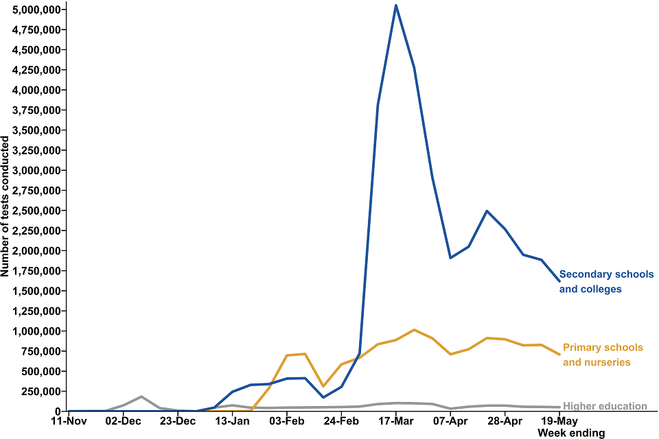 Similarly, within secondary schools and colleges, the number of LFD tests conducted increased steeply to over 5.7 million in the week beginning 11 March which coincided with the return to schools. In the latest week (13 May to 19 May 2021), the number of tests has decreased to 1,635,568 compared to 1,904,377 in the previous week. This follows an increase in tests in week ending 21 April which coincided with the start of the summer term for schools. Since then, the number of positive test results has decreased to 1,586 positive results in the latest week.
