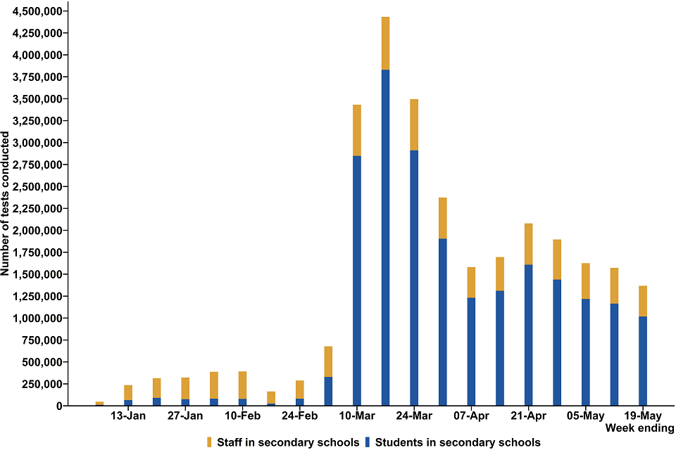 In the latest week ending 19 May, 1,018,020 LFD tests were taken by students in secondary schools which is a decrease from 1,164,543 tests in the previous week. Of these, 27,138 tests were assisted at a test site and 990,882 tests were self-reported.