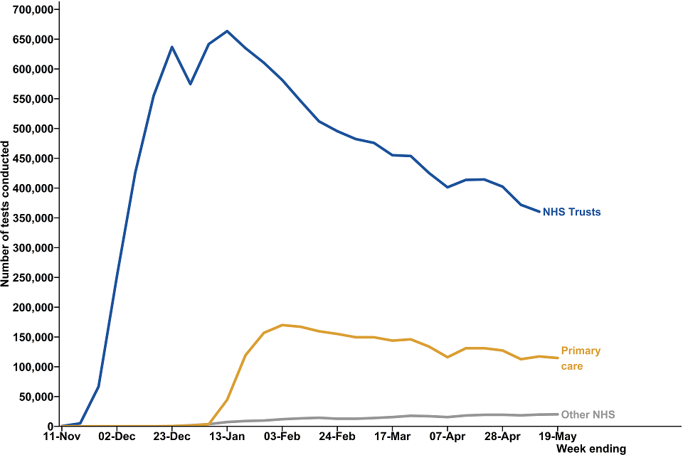 The majority of tests reported by other NHS staff, include members of staff working in the independent sector who have also had access to twice weekly LFD testing. In the latest week ending 19 May, 20,144 tests were conducted by other NHS employees which is an increase from 19,708 tests in the previous week and 24 positive test results were received.