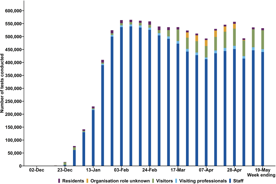 The number of PCR tests conducted within care homes increased overall from 40,000 tests in the week commencing 25 June 2020 to over 590,000 tests in the week commencing 7 January 2021. There has been a decrease in the latest week (13 May to 19 May) to 453,262, from 494,075 in the previous week (6 May to 12 May).
