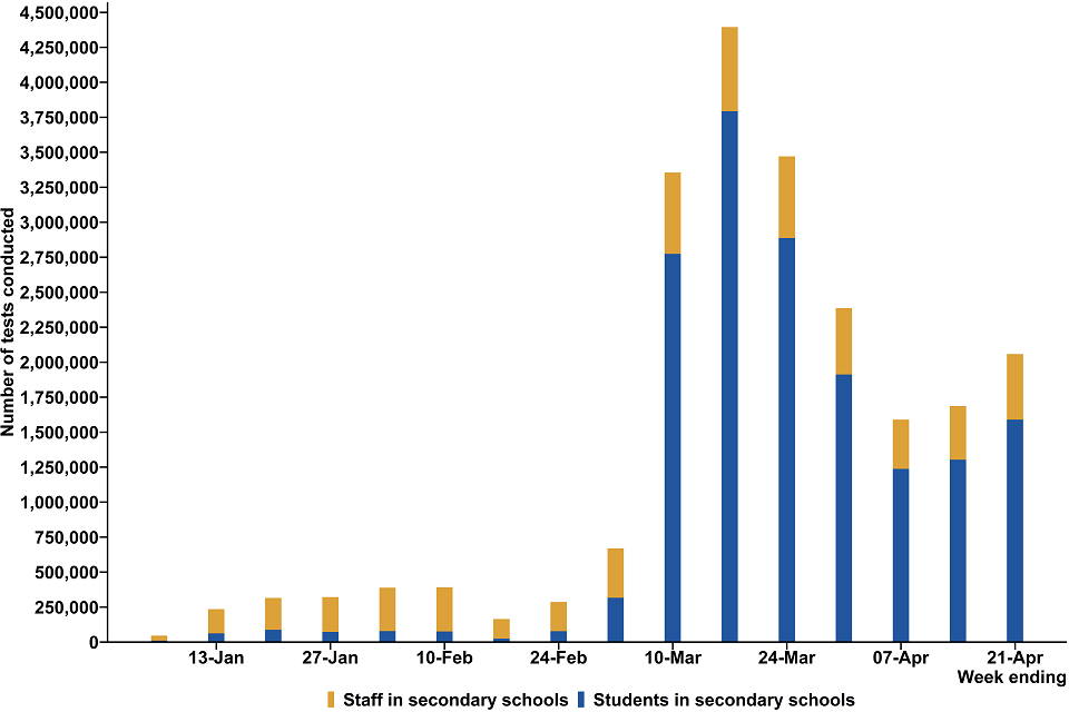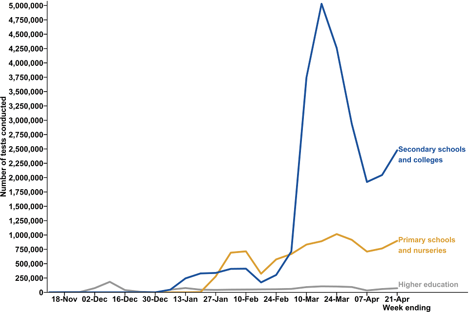 In the latest week ending 21 April, 1,588,974 LFD tests were taken by students in secondary schools which is an increase from 1,303,404 tests in the previous week; this coincides with the students return to school for the summer term. This increase follows a decrease in tests seen in the previous weeks, which coincided with the Easter holidays.