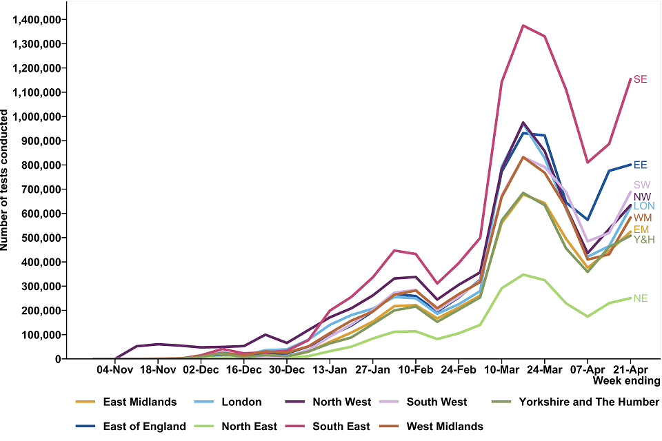 The number of LFD tests conducted has increased across all regions in the latest week. This follows a decrease in the number of LFD tests conducted between 25 March and 17 April 2021 which coincided with the Easter holidays for schools. Between 8 April and 21 April 2021, the most LFD tests were conducted in the South East followed by the East of England.
