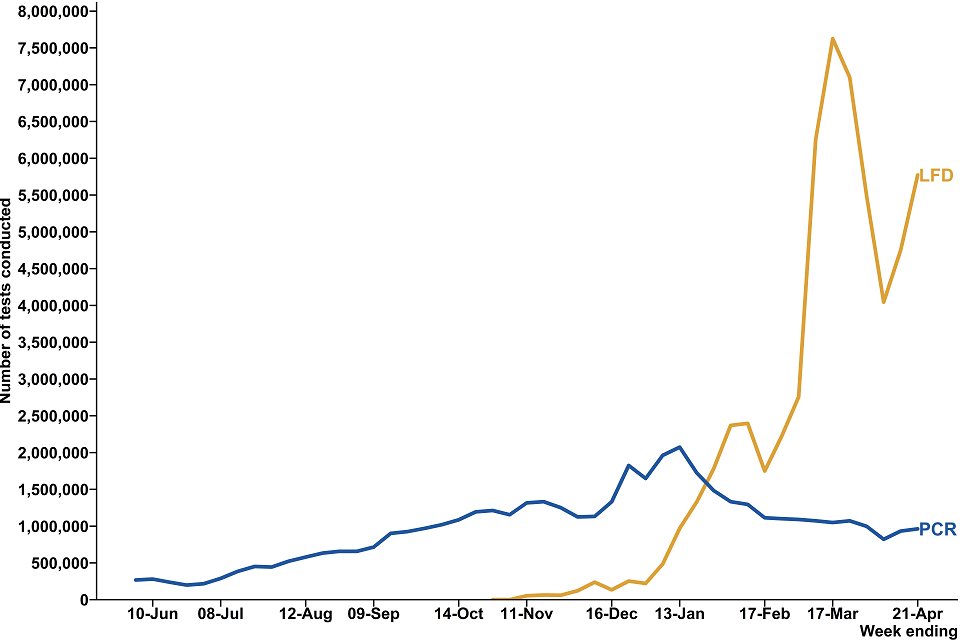 PCR and LFD tests have different uses and are therefore applied in different situations (see the ‘Types of tests’ section above for more information). The primary purpose of rapid LFD testing is to identify people with COVID-19 who do not have symptoms. As the number of LFD tests conducted increases, more asymptomatic positive cases are identified earlier and therefore they are less likely to transmit the virus to their contacts.