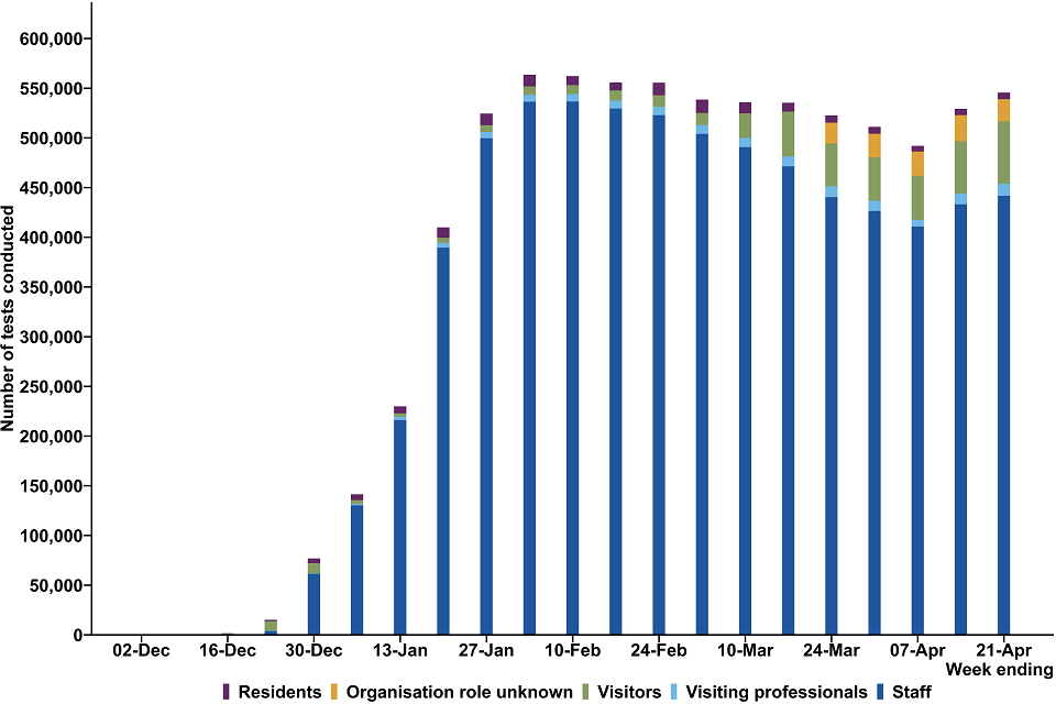 The number of PCR tests conducted within care homes increased overall from 40,000 tests in the week commencing 25 June 2020 to over 550,000 tests in the week commencing 7 January 2021. There has been a decrease in the latest week (15 to 21 April) to 455,167, from 474,608 in the previous week (8 to 14 April).