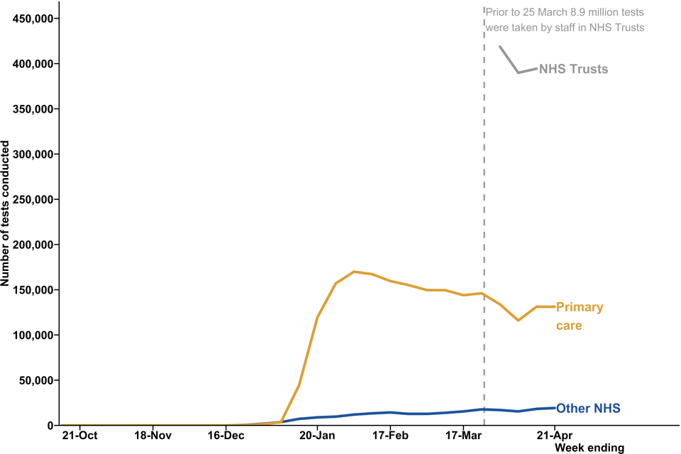 The majority of tests reported by other NHS staff, include members of staff working in the independent sector who have also had access to twice weekly LFD testing. In the latest week ending 21 April, 19,317 tests were conducted by other NHS employees which is an increase from 18,266 tests in the previous week and 28 positive test results were received.
