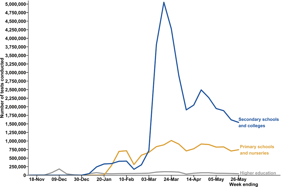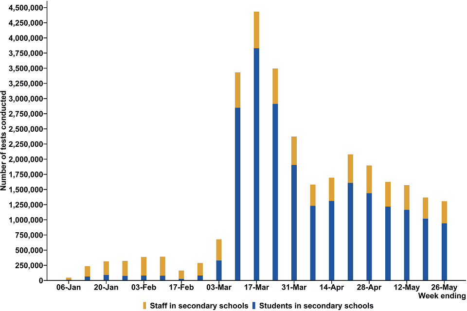 In the latest week ending 26 May, 941,860 LFD tests were taken by students in secondary schools which is a decrease from 1,018,200 tests in the previous week. Of these, 30,497 tests were assisted at a test site and 911,363 tests were self-reported.