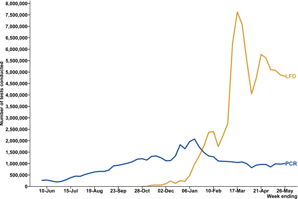 Prior to 27 January 2021, if an individual received a positive LFD test result, they were routinely asked to take a PCR test to confirm this. Between 27 January and 29 March 2021, confirmatory PCR was temporarily suspended, except for those self-reporting their test result and for some other use cases such as testing for cross-channel hauliers. From 30 March 2021, confirmatory PCR testing was reinstated for all positive LFD tests, taking into account the lower prevalence of COVID-19 and the benefits of PCR testing for detecting variants of concern.