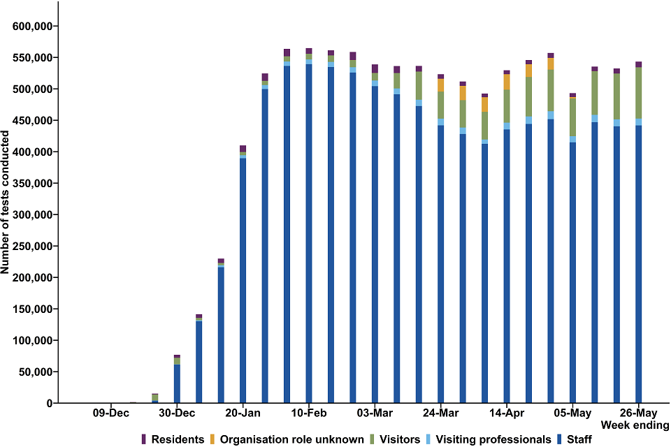 In the latest week, 10,905 LFD tests were taken by visiting professionals in care homes, in comparison with 81,631 tests taken by visitors. The number of tests conducted by visitors increased in the latest week (20 May to 26 May).