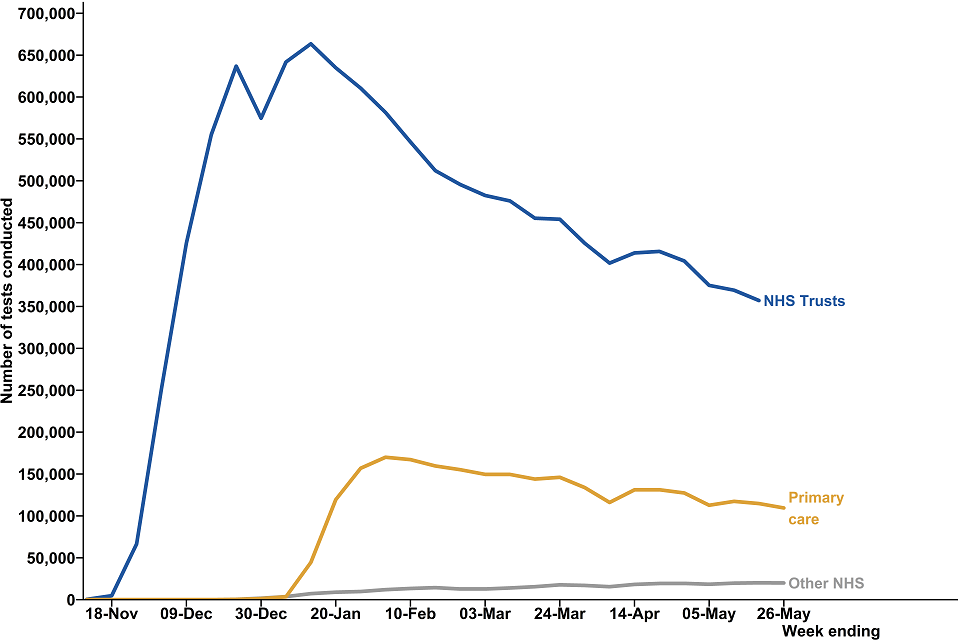 The majority of tests reported by other NHS staff, include members of staff working in the independent sector who have also had access to twice weekly LFD testing. In the latest week ending 26 May, 19,967 tests were conducted by other NHS employees which is a decrease from 20,144 tests in the previous week and 11 positive test results were received.