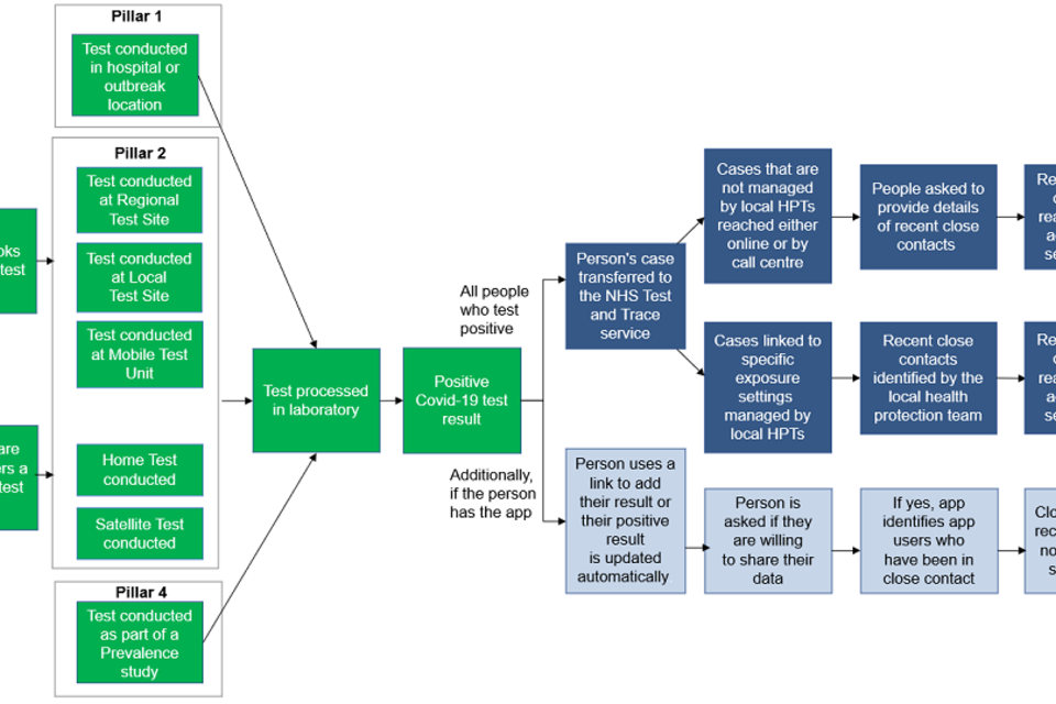 NHS Test and Trace starts with an individual taking a swab test for the virus, either in pillar 1 (testing in hospitals and outbreak locations), pillar 2 (national swab testing) or pillar 4 (prevalence studies). Those who go on to test positive will have their case transferred to NHS Test and Trace for contact tracing.