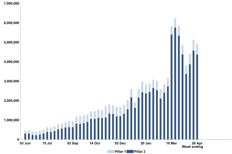 Between 22 April and 28 April 2021, 4,914,409 people were tested for coronavirus (COVID-19) at least once,[footnote 5] a 4% decrease compared to the previous week.